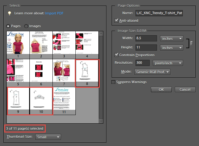 - Photoshop Elements will then display a grid of pages available to be opened. Holding down the <SHIFT> key, select the pages that contain the pattern pieces. Be sure that you see the number of pages selected matches what you believe needs to be opened.