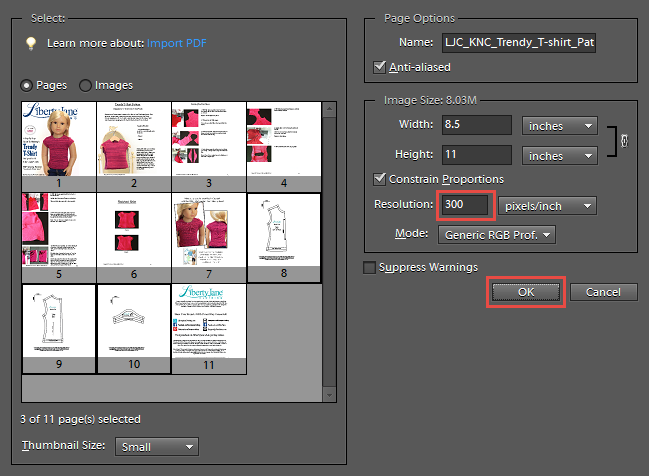 - Before you click the <OK> button, be sure that the resolution is at about 300 dpi. I do this just in case I need to get a higher resolution version of the page later. Once you’ve ensured that the resolution is high enough, click the <OK> button to convert the files to Photoshop format.
