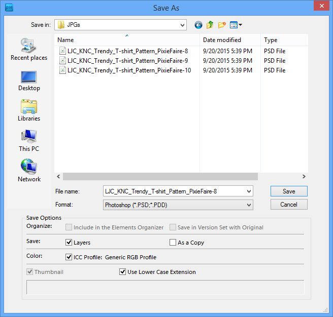 - I like to save each file as a Photoshop file, in case something goes wrong. It’s best to do that at a higher resolution than what you need for the JPG file, so I save them at 300 dpi. One at a time, save the files as Photoshop pages.