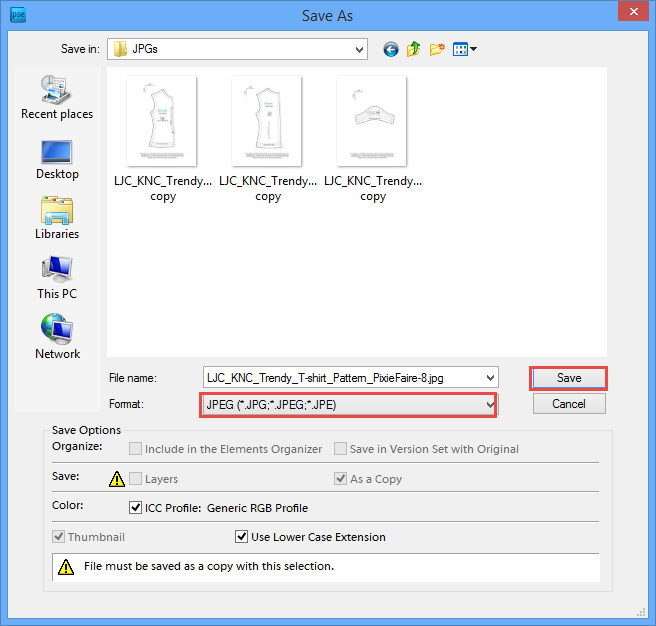- Convert the PDF file directly to a JPG file. The advantage of this is that I will be able to convert my file exactly as it is in the pattern, without having to worry about whether the paper is straight enough, or dark enough for a perfect scan. The disadvantage is that it requires additional software. I use Adobe Elements because it can directly open a PDF page and save it in a graphical format.
