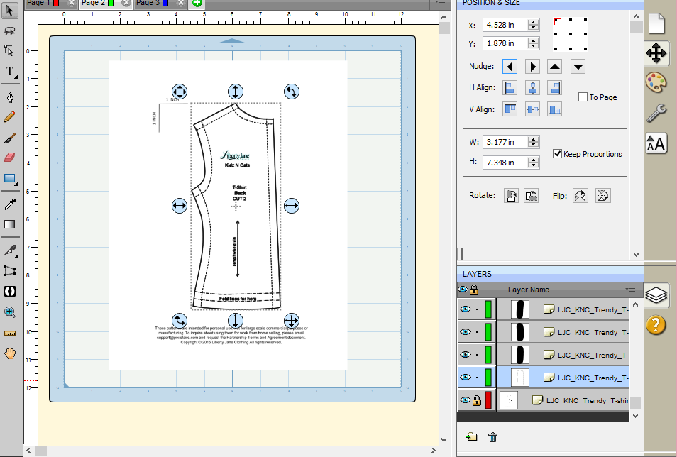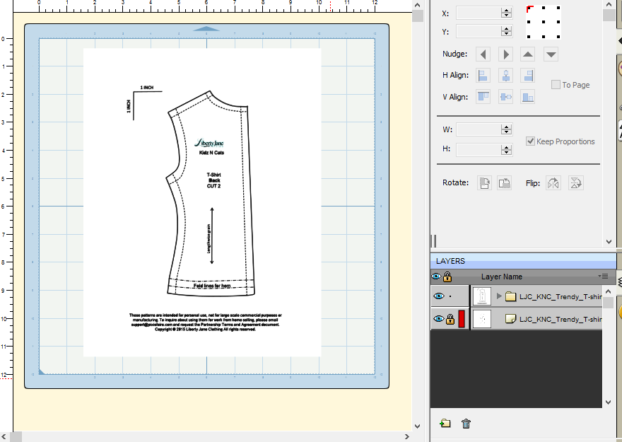 There are a few issues with this pattern piece that need to be corrected before adding the draw lines. We’ll cover that in the next step. The first issue is that the pattern piece is not straight on the page. While this isn’t a problem when printing to a standard printer, it will be a problem with the cutter. Everything needs to be cut on the straight grain. Also, while it’s not easy to see in this view, the cut lines actually have a few extra cuts in them that need to be deleted. We’ll do that in Step 5.