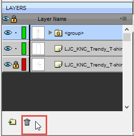- Since we don’t need anything except what’s in the pattern piece, or the <group>, let’s delete the other parts of the page so they’re not in the way. To do that, select the “extra stuff” on the Layers menu, then hit the Trash Can icon: