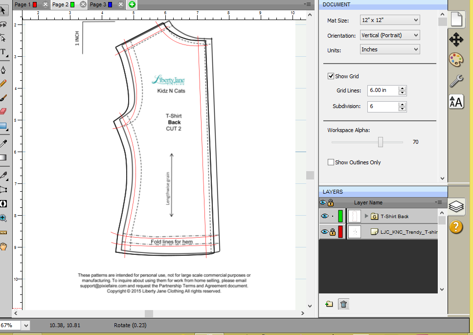 - Drag the pattern piece and new Grain Line so that the Grain Line is right on top of one of the grid lines. Double-check to make sure the pattern is perfectly aligned on the page to the grain line.