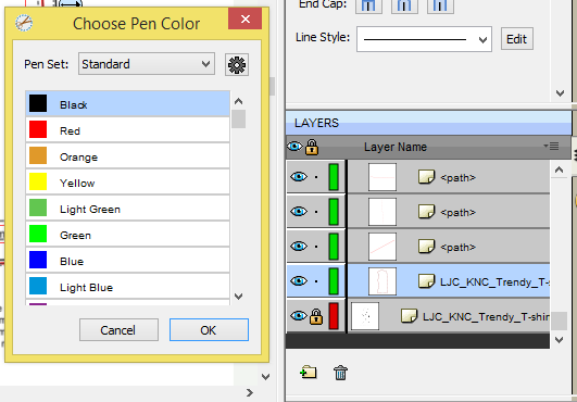 - Since most of the pieces of the pattern are draw lines, let’s make all the pattern lines red. We’ll change the cut line to black afterwards. With the entire group selected, click the color square to the right of Stroke: Pen Color. When the pop-up window appears, select Red: